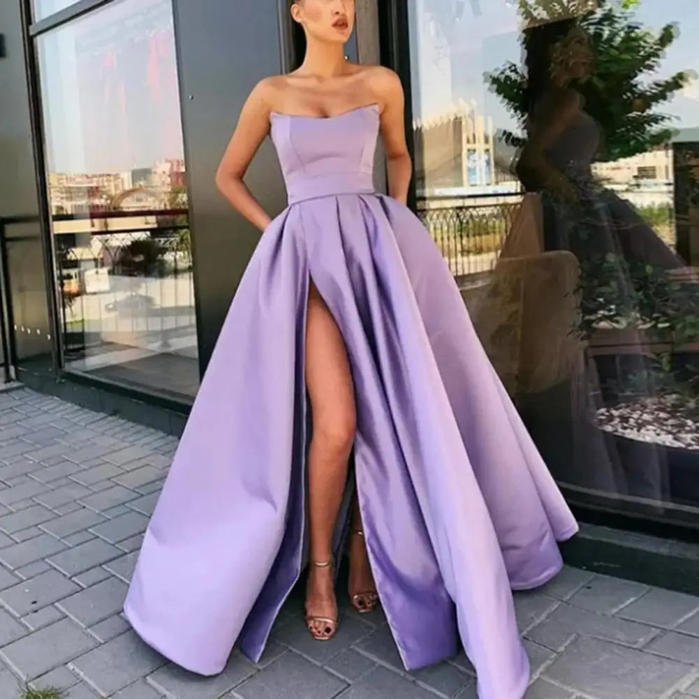 - Striking Details: Off-shoulder bandeau design with a flowing A-line silhouette and bold high slit for head-turning appeal.